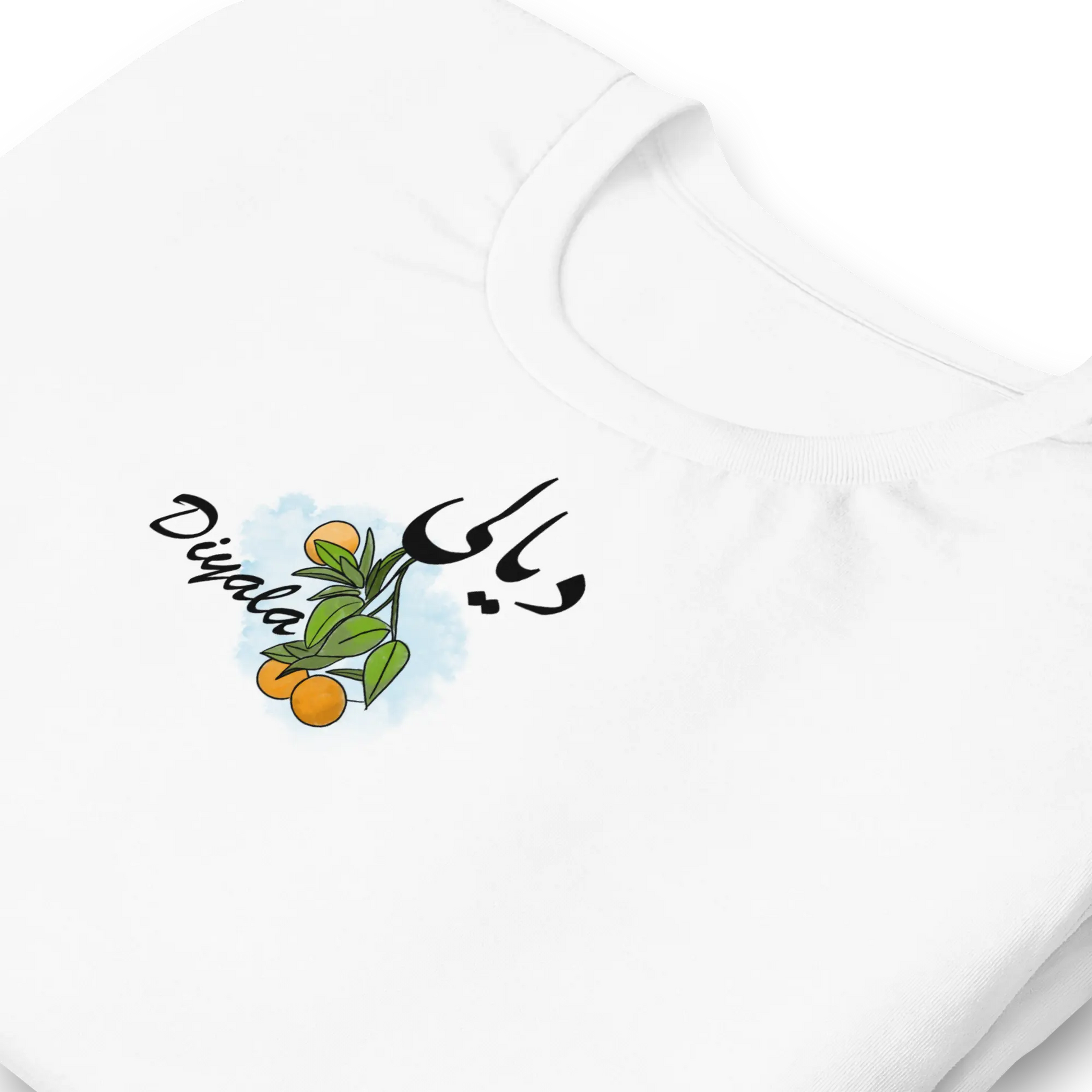 The Diyala City Collection shirt pays tribute to the vibrant province of Diyala, featuring its name in English and Arabic, boldly displayed alongside an emblem representing its rich landscapes and cultural heritage. Diyala is famous for its orange groves, particularly the renowned Diyala cultivar, symbolising the province’s deep agricultural roots and natural beauty.